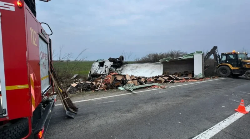 Autocamionul implicat în accident s-a răsturnat pe carosabil. Acesta transporta mere, iar în urma impactului întreaga încărcătură s-a împrăștiat pe drum.