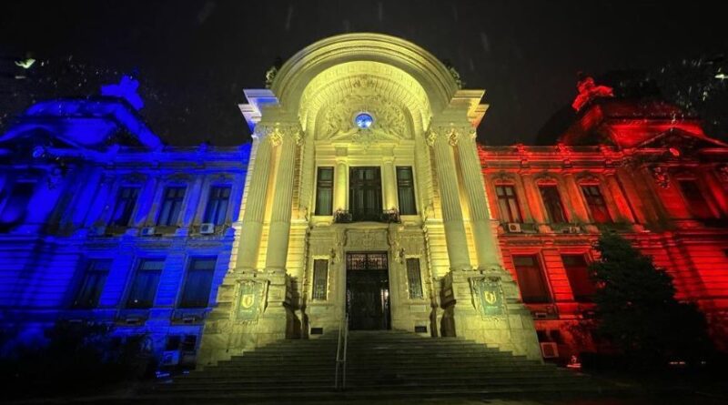 Palatul CEC, una dintre clădirile emblematice ale Bucureştiului, a fost iluminat în culorile tricolorului, pentru a marca Ziua Naţională a României.