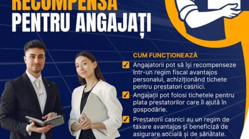 „Angajatorii care oferă tichete de activităţi casnice beneficiază şi de avantaje fiscale. Dacă un angajator acordă cel puţin 600 de tichete unui salariat într-un an, va primi în anul următor 50 de tichete gratuite, care pot fi distribuite ca primă sau bonus altor angajaţi. Implementarea sistemului de tichete de activităţi casnice are potenţialul de a stimula participarea persoanelor în cadrul unui raport juridic flexibil care le conferă şi calitatea de asiguraţi în sistemul public de pensii şi în sistemul asigurărilor de sănătate”, a declarat ministrul Simona Bucura-Oprescu.